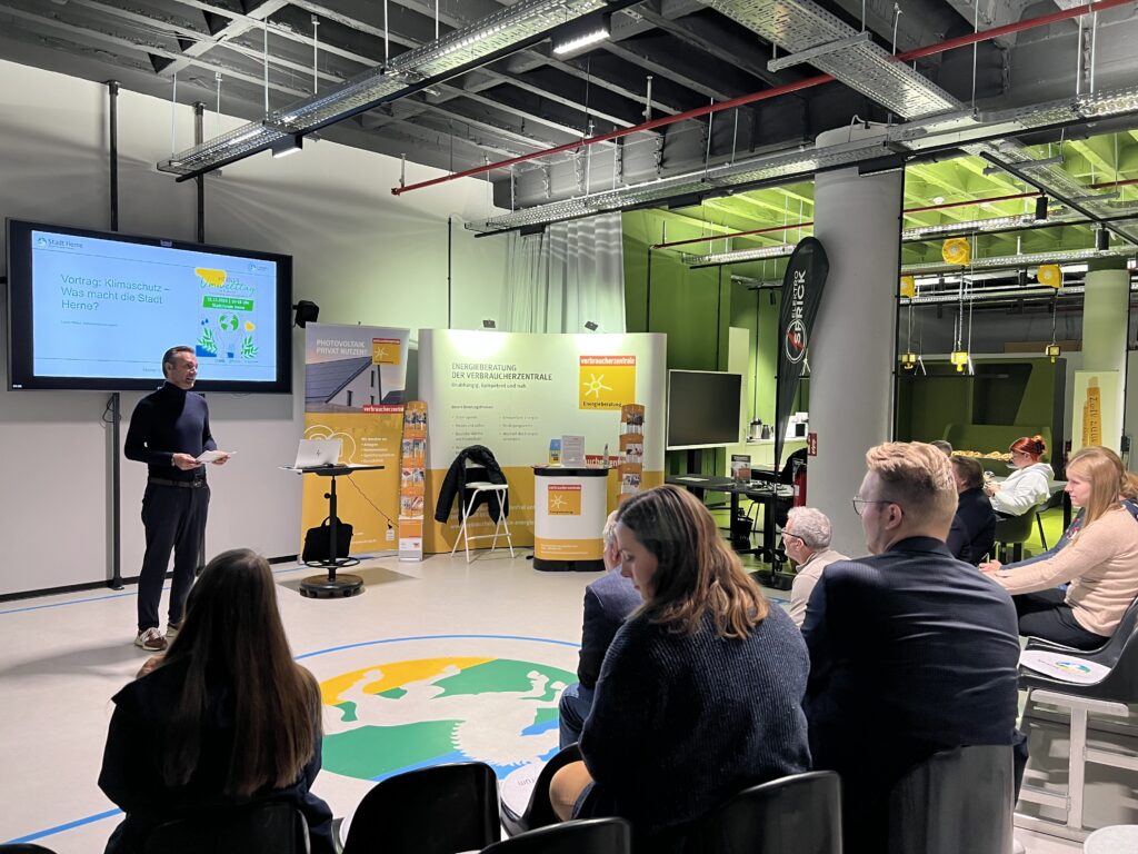 Laura Wloka, Klimaschutzmanagerin der Stadt Herne, erläuterte aktuelle kommunale Klimaschutzprojekte und gab einen Einblick in das neue Klima-Dashboard, das Bürger*innen unterschiedliche Daten zur Klimasituation in Herne bereitstellt.